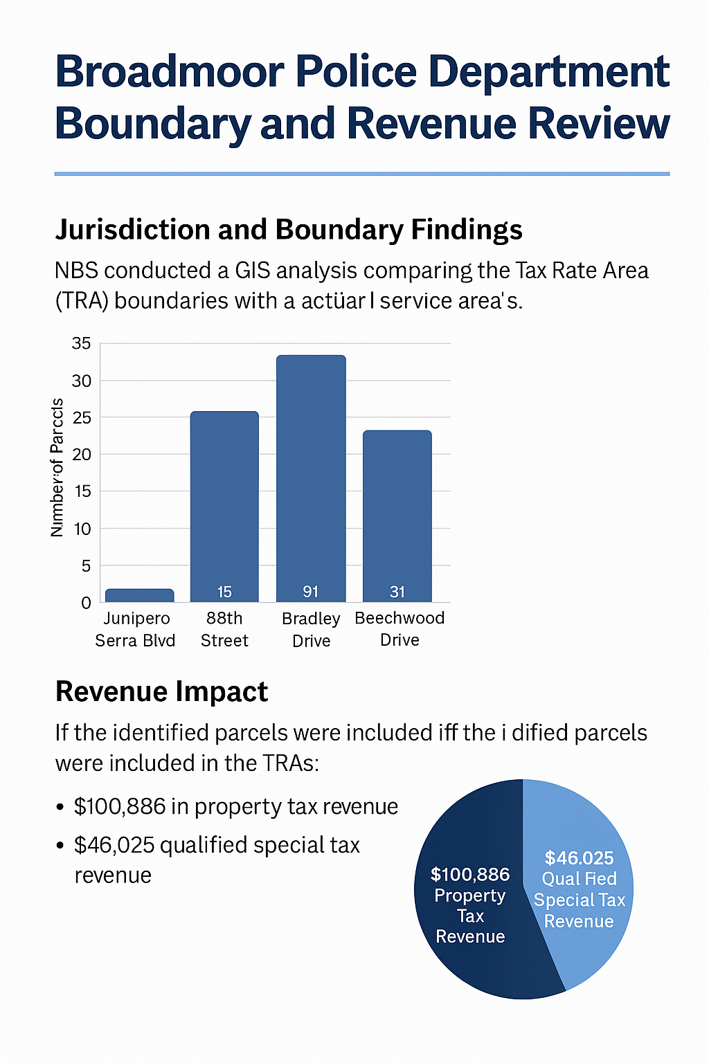 The Broadmoor Police Protection District contracted NBS (A public finance consulting firm) and HdL (A property tax analytics/audits firm). Both firms ensure all areas receiving police services are properly included within the District’s official tax boundaries and that revenues are collected fairly and accurately.